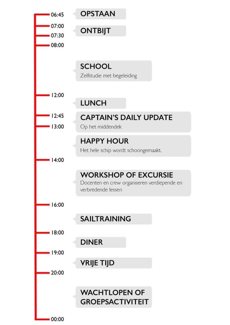 De reis is dus geen vakantie. Het schoolwerk gaat gewoon door, door middel van zelfstudie. Je maakt zelf een planning voor je vertrek, en werkt dan 6 dagen per week aan de lesstof van school. De zelfstudie-uren zijn van 8.00 tot 12.00, en er lopen altijd docenten rond van voornamelijk de bètavakken, die kunnen helpen bij het beantwoorden van vragen. Als er toetsen moeten worden gemaakt in de periodes dat je weg bent, maak je die ook aan boord.